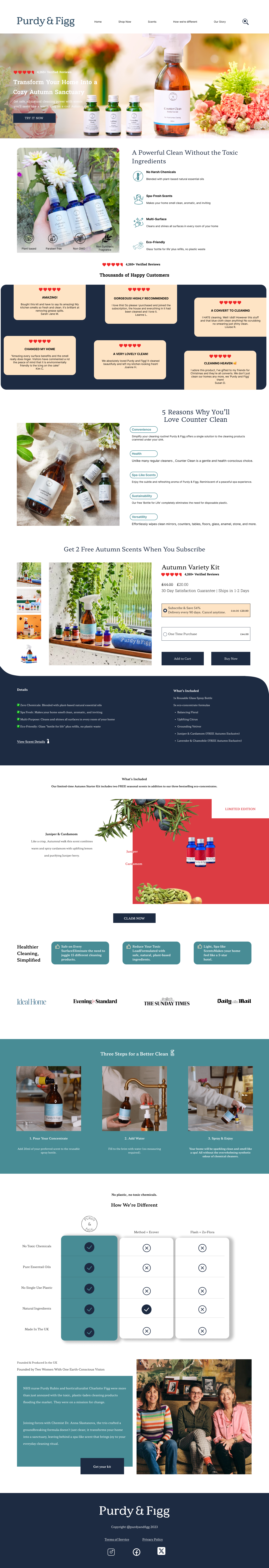 Purdy and Figg’s landing page introduces their range of non-toxic, eco-friendly cleaning liquids that combine effective cleaning with delightful fragrances. Designed to leave a lasting impression, the page emphasizes the brand’s values of sustainability, safety, and innovation.